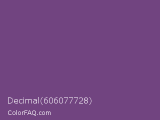 Decimal 606077728 Color is a normal purple color and the nearest color is Maximum Purple #733380. Hex code #714480 and RGB value is rgb(113,68,128). In RGB color space, this color is composed of 44% red, 27% green, 50% blue, In CMYK color space, this color is composed of 12% cyan, 47% magenta, 0% yellow , 50% black , In HSL color space, this color has a hue angle of 285° , 31% saturation and 38% lightness.