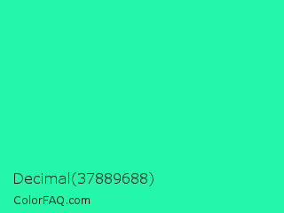 Decimal 37889688 Color is a normal green color and the nearest color is Medium Spring Green #00fa9a. Hex code #24f7aa and RGB value is rgb(36,247,170). In RGB color space, this color is composed of 14% red, 97% green, 67% blue, In CMYK color space, this color is composed of 85% cyan, 0% magenta, 31% yellow , 3% black , In HSL color space, this color has a hue angle of 158° , 93% saturation and 55% lightness.