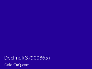 Decimal 37900865 Color is a dark indigo color and the nearest color is Blue Gem #2c0e8c. Hex code #250199 and RGB value is rgb(37,1,153). In RGB color space, this color is composed of 15% red, 0% green, 60% blue, In CMYK color space, this color is composed of 76% cyan, 99% magenta, 0% yellow , 40% black , In HSL color space, this color has a hue angle of 254° , 99% saturation and 30% lightness.
