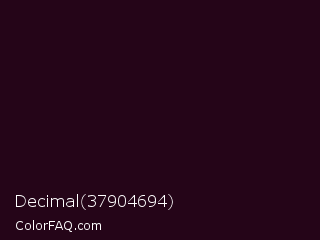 Decimal 37904694 Color is a almost black magenta color and the nearest color is Gondola #261414. Hex code #250518 and RGB value is rgb(37,5,24). In RGB color space, this color is composed of 15% red, 2% green, 9% blue, In CMYK color space, this color is composed of 0% cyan, 86% magenta, 35% yellow , 85% black , In HSL color space, this color has a hue angle of 324° , 76% saturation and 8% lightness.