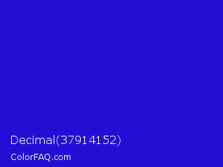 Decimal 37914152 Color is a normal indigo color and the nearest color is Interdimensional Blue #360ccc. Hex code #250ed4 and RGB value is rgb(37,14,212). In RGB color space, this color is composed of 15% red, 5% green, 83% blue, In CMYK color space, this color is composed of 83% cyan, 93% magenta, 0% yellow , 17% black , In HSL color space, this color has a hue angle of 247° , 88% saturation and 44% lightness.