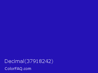 Decimal 37918242 Color is a normal indigo color and the nearest color is Interdimensional Blue #360ccc. Hex code #2512b6 and RGB value is rgb(37,18,182). In RGB color space, this color is composed of 15% red, 7% green, 71% blue, In CMYK color space, this color is composed of 80% cyan, 90% magenta, 0% yellow , 29% black , In HSL color space, this color has a hue angle of 247° , 82% saturation and 39% lightness.