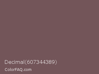 Decimal 607344389 Color is a normal red color and the nearest color is Russett #755a57. Hex code #735559 and RGB value is rgb(115,85,89). In RGB color space, this color is composed of 45% red, 33% green, 35% blue, In CMYK color space, this color is composed of 0% cyan, 26% magenta, 23% yellow , 55% black , In HSL color space, this color has a hue angle of 352° , 15% saturation and 39% lightness.
