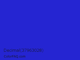 Decimal 37963028 Color is a normal blue color and the nearest color is Palatinate Blue #273be2. Hex code #2525d2 and RGB value is rgb(37,37,210). In RGB color space, this color is composed of 15% red, 15% green, 82% blue, In CMYK color space, this color is composed of 82% cyan, 82% magenta, 0% yellow , 18% black , In HSL color space, this color has a hue angle of 240° , 70% saturation and 48% lightness.