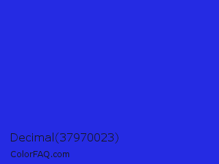 Decimal 37970023 Color is a normal blue color and the nearest color is Palatinate Blue #273be2. Hex code #252be3 and RGB value is rgb(37,43,227). In RGB color space, this color is composed of 15% red, 17% green, 89% blue, In CMYK color space, this color is composed of 84% cyan, 81% magenta, 0% yellow , 11% black , In HSL color space, this color has a hue angle of 238° , 77% saturation and 52% lightness.