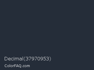 Decimal 37970953 Color is a very dark blue color and the nearest color is Ebony Clay #26283b. Hex code #252d39 and RGB value is rgb(37,45,57). In RGB color space, this color is composed of 15% red, 18% green, 22% blue, In CMYK color space, this color is composed of 35% cyan, 21% magenta, 0% yellow , 78% black , In HSL color space, this color has a hue angle of 216° , 21% saturation and 18% lightness.