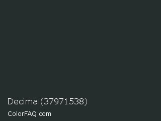 Decimal 37971538 Color is a very dark cyan color and the nearest color is Charleston Green #232b2b. Hex code #252e2c and RGB value is rgb(37,46,44). In RGB color space, this color is composed of 15% red, 18% green, 17% blue, In CMYK color space, this color is composed of 20% cyan, 0% magenta, 4% yellow , 82% black , In HSL color space, this color has a hue angle of 167° , 11% saturation and 16% lightness.
