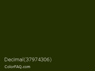 Decimal 37974306 Color is a very dark lime color and the nearest color is Turtle Green #2a380b. Hex code #253002 and RGB value is rgb(37,48,2). In RGB color space, this color is composed of 15% red, 19% green, 1% blue, In CMYK color space, this color is composed of 23% cyan, 0% magenta, 96% yellow , 81% black , In HSL color space, this color has a hue angle of 74° , 92% saturation and 10% lightness.