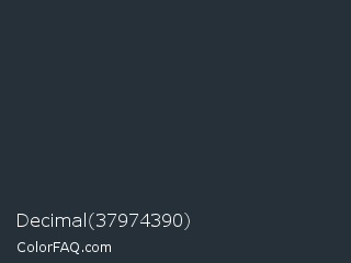 Decimal 37974390 Color is a very dark blue color and the nearest color is Gunmetal #2a3439. Hex code #253038 and RGB value is rgb(37,48,56). In RGB color space, this color is composed of 15% red, 19% green, 22% blue, In CMYK color space, this color is composed of 34% cyan, 14% magenta, 0% yellow , 78% black , In HSL color space, this color has a hue angle of 205° , 20% saturation and 18% lightness.