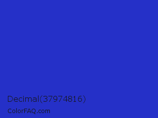Decimal 37974816 Color is a normal blue color and the nearest color is Persian Blue #1c39bb. Hex code #2530c8 and RGB value is rgb(37,48,200). In RGB color space, this color is composed of 15% red, 19% green, 78% blue, In CMYK color space, this color is composed of 82% cyan, 76% magenta, 0% yellow , 22% black , In HSL color space, this color has a hue angle of 236° , 69% saturation and 46% lightness.