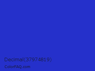 Decimal 37974819 Color is a normal blue color and the nearest color is Persian Blue #1c39bb. Hex code #2530cb and RGB value is rgb(37,48,203). In RGB color space, this color is composed of 15% red, 19% green, 80% blue, In CMYK color space, this color is composed of 82% cyan, 76% magenta, 0% yellow , 20% black , In HSL color space, this color has a hue angle of 236° , 69% saturation and 47% lightness.