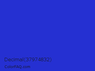Decimal 37974832 Color is a normal blue color and the nearest color is Palatinate Blue #273be2. Hex code #2530d2 and RGB value is rgb(37,48,210). In RGB color space, this color is composed of 15% red, 19% green, 82% blue, In CMYK color space, this color is composed of 82% cyan, 77% magenta, 0% yellow , 18% black , In HSL color space, this color has a hue angle of 236° , 70% saturation and 48% lightness.