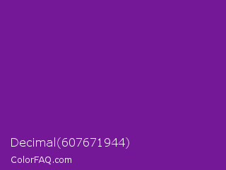 Decimal 607671944 Color is a normal purple color and the nearest color is Seance #731e8f. Hex code #741898 and RGB value is rgb(116,24,152). In RGB color space, this color is composed of 45% red, 9% green, 60% blue, In CMYK color space, this color is composed of 24% cyan, 84% magenta, 0% yellow , 40% black , In HSL color space, this color has a hue angle of 283° , 73% saturation and 35% lightness.