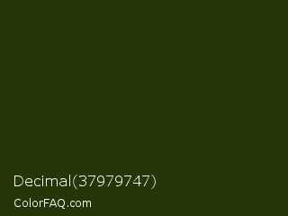Decimal 37979747 Color is a very dark green color and the nearest color is Turtle Green #2a380b. Hex code #253607 and RGB value is rgb(37,54,7). In RGB color space, this color is composed of 15% red, 21% green, 3% blue, In CMYK color space, this color is composed of 31% cyan, 0% magenta, 87% yellow , 79% black , In HSL color space, this color has a hue angle of 82° , 77% saturation and 12% lightness.