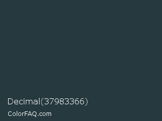Decimal 37983366 Color is a very dark cyan color and the nearest color is Gunmetal #2a3439. Hex code #25393e and RGB value is rgb(37,57,62). In RGB color space, this color is composed of 15% red, 22% green, 24% blue, In CMYK color space, this color is composed of 40% cyan, 8% magenta, 0% yellow , 76% black , In HSL color space, this color has a hue angle of 192° , 25% saturation and 19% lightness.