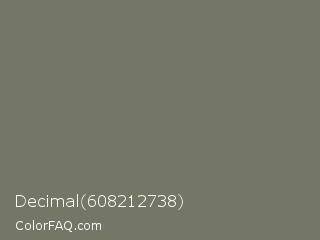 Decimal 608212738 Color is a normal yellow color and the nearest color is Limed Ash #747d63. Hex code #747666 and RGB value is rgb(116,118,102). In RGB color space, this color is composed of 45% red, 46% green, 40% blue, In CMYK color space, this color is composed of 2% cyan, 0% magenta, 14% yellow , 54% black , In HSL color space, this color has a hue angle of 68° , 7% saturation and 43% lightness.