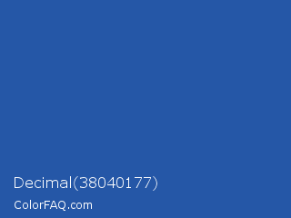 Decimal 38040177 Color is a normal blue color and the nearest color is Cyan Cobalt Blue #28589c. Hex code #2557a7 and RGB value is rgb(37,87,167). In RGB color space, this color is composed of 15% red, 34% green, 65% blue, In CMYK color space, this color is composed of 78% cyan, 48% magenta, 0% yellow , 35% black , In HSL color space, this color has a hue angle of 217° , 64% saturation and 40% lightness.