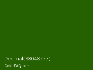 Decimal 38048777 Color is a very dark green color and the nearest color is Lincoln Green #195905. Hex code #256001 and RGB value is rgb(37,96,1). In RGB color space, this color is composed of 15% red, 38% green, 0% blue, In CMYK color space, this color is composed of 61% cyan, 0% magenta, 99% yellow , 62% black , In HSL color space, this color has a hue angle of 97° , 98% saturation and 19% lightness.