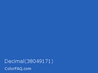 Decimal 38049171 Color is a normal blue color and the nearest color is Cerulean Blue #2a52be. Hex code #2560b9 and RGB value is rgb(37,96,185). In RGB color space, this color is composed of 15% red, 38% green, 73% blue, In CMYK color space, this color is composed of 80% cyan, 48% magenta, 0% yellow , 27% black , In HSL color space, this color has a hue angle of 216° , 67% saturation and 44% lightness.