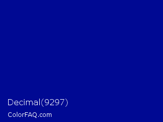 Decimal 9297 Color is a dark blue color and the nearest color is Phthalo Blue #000f89. Hex code #000993 and RGB value is rgb(0,9,147). In RGB color space, this color is composed of 0% red, 4% green, 58% blue, In CMYK color space, this color is composed of 100% cyan, 94% magenta, 0% yellow , 42% black , In HSL color space, this color has a hue angle of 236° , 100% saturation and 29% lightness.