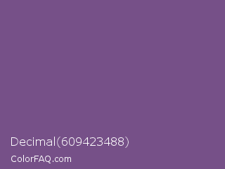 Decimal 609423488 Color is a normal purple color and the nearest color is Dark Lavender #734f96. Hex code #765088 and RGB value is rgb(118,80,136). In RGB color space, this color is composed of 46% red, 31% green, 53% blue, In CMYK color space, this color is composed of 13% cyan, 41% magenta, 0% yellow , 47% black , In HSL color space, this color has a hue angle of 281° , 26% saturation and 42% lightness.