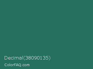 Decimal 38090135 Color is a dark cyan color and the nearest color is Casal #2f6168. Hex code #25705d and RGB value is rgb(37,112,93). In RGB color space, this color is composed of 15% red, 44% green, 36% blue, In CMYK color space, this color is composed of 67% cyan, 0% magenta, 17% yellow , 56% black , In HSL color space, this color has a hue angle of 165° , 50% saturation and 29% lightness.