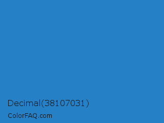 Decimal 38107031 Color is a normal blue color and the nearest color is Cyan Cornflower Blue #188bc2. Hex code #2580c5 and RGB value is rgb(37,128,197). In RGB color space, this color is composed of 15% red, 50% green, 77% blue, In CMYK color space, this color is composed of 81% cyan, 35% magenta, 0% yellow , 23% black , In HSL color space, this color has a hue angle of 206° , 68% saturation and 46% lightness.
