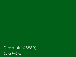 Decimal 148889 Color is a very dark green color and the nearest color is Camarone #00581a. Hex code #006017 and RGB value is rgb(0,96,23). In RGB color space, this color is composed of 0% red, 38% green, 9% blue, In CMYK color space, this color is composed of 100% cyan, 0% magenta, 76% yellow , 62% black , In HSL color space, this color has a hue angle of 134° , 100% saturation and 19% lightness.