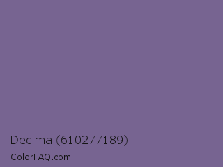 Decimal 610277189 Color is a normal violet color and the nearest color is Rum #796989. Hex code #776491 and RGB value is rgb(119,100,145). In RGB color space, this color is composed of 47% red, 39% green, 57% blue, In CMYK color space, this color is composed of 18% cyan, 31% magenta, 0% yellow , 43% black , In HSL color space, this color has a hue angle of 265° , 18% saturation and 48% lightness.