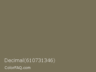 Decimal 610731346 Color is a normal yellow color and the nearest color is Crocodile #736d58. Hex code #787158 and RGB value is rgb(120,113,88). In RGB color space, this color is composed of 47% red, 44% green, 35% blue, In CMYK color space, this color is composed of 0% cyan, 6% magenta, 27% yellow , 53% black , In HSL color space, this color has a hue angle of 47° , 15% saturation and 41% lightness.