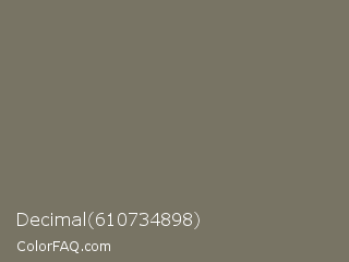 Decimal 610734898 Color is a normal yellow color and the nearest color is Pablo #776f61. Hex code #787464 and RGB value is rgb(120,116,100). In RGB color space, this color is composed of 47% red, 45% green, 39% blue, In CMYK color space, this color is composed of 0% cyan, 3% magenta, 17% yellow , 53% black , In HSL color space, this color has a hue angle of 48° , 9% saturation and 43% lightness.