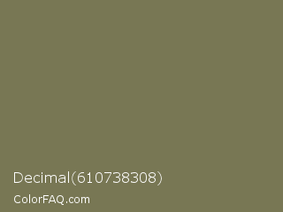 Decimal 610738308 Color is a normal yellow color and the nearest color is Crocodile #736d58. Hex code #787754 and RGB value is rgb(120,119,84). In RGB color space, this color is composed of 47% red, 47% green, 33% blue, In CMYK color space, this color is composed of 0% cyan, 1% magenta, 30% yellow , 53% black , In HSL color space, this color has a hue angle of 58° , 18% saturation and 40% lightness.