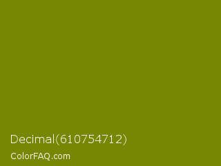 Decimal 610754712 Color is a dark yellow color and the nearest color is Olive #808000. Hex code #788702 and RGB value is rgb(120,135,2). In RGB color space, this color is composed of 47% red, 53% green, 1% blue, In CMYK color space, this color is composed of 11% cyan, 0% magenta, 99% yellow , 47% black , In HSL color space, this color has a hue angle of 67° , 97% saturation and 27% lightness.