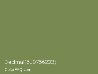 Decimal 610756233 Color is a normal lime color and the nearest color is Highland #6f8e63. Hex code #788951 and RGB value is rgb(120,137,81). In RGB color space, this color is composed of 47% red, 54% green, 32% blue, In CMYK color space, this color is composed of 12% cyan, 0% magenta, 41% yellow , 46% black , In HSL color space, this color has a hue angle of 78° , 26% saturation and 43% lightness.