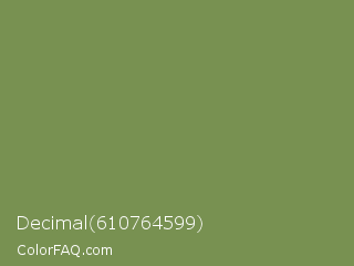Decimal 610764599 Color is a normal green color and the nearest color is Asparagus Green #7ba05b. Hex code #789151 and RGB value is rgb(120,145,81). In RGB color space, this color is composed of 47% red, 57% green, 32% blue, In CMYK color space, this color is composed of 17% cyan, 0% magenta, 44% yellow , 43% black , In HSL color space, this color has a hue angle of 83° , 28% saturation and 44% lightness.