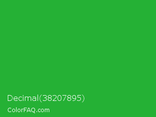 Decimal 38207895 Color is a normal green color and the nearest color is Wageningen Green #34b233. Hex code #25b135 and RGB value is rgb(37,177,53). In RGB color space, this color is composed of 15% red, 69% green, 21% blue, In CMYK color space, this color is composed of 79% cyan, 0% magenta, 70% yellow , 31% black , In HSL color space, this color has a hue angle of 127° , 65% saturation and 42% lightness.