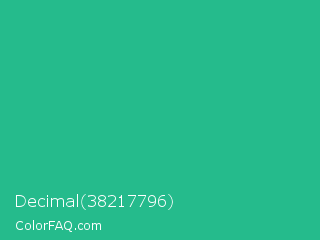 Decimal 38217796 Color is a normal green color and the nearest color is Mountain Meadow #30ba8f. Hex code #25bb8c and RGB value is rgb(37,187,140). In RGB color space, this color is composed of 15% red, 73% green, 55% blue, In CMYK color space, this color is composed of 80% cyan, 0% magenta, 25% yellow , 27% black , In HSL color space, this color has a hue angle of 161° , 67% saturation and 44% lightness.