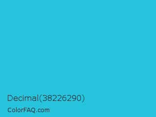 Decimal 38226290 Color is a normal cyan color and the nearest color is Scooter #2ebfd4. Hex code #25c3dc and RGB value is rgb(37,195,220). In RGB color space, this color is composed of 15% red, 76% green, 86% blue, In CMYK color space, this color is composed of 83% cyan, 11% magenta, 0% yellow , 14% black , In HSL color space, this color has a hue angle of 188° , 72% saturation and 50% lightness.