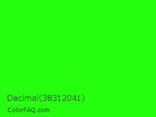 Decimal 38312041 Color is a normal green color and the nearest color is Neon Green #39ff14. Hex code #25fe0d and RGB value is rgb(37,254,13). In RGB color space, this color is composed of 15% red, 100% green, 5% blue, In CMYK color space, this color is composed of 85% cyan, 0% magenta, 95% yellow , 0% black , In HSL color space, this color has a hue angle of 114° , 99% saturation and 52% lightness.