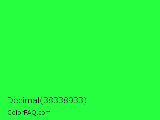 Decimal 38338933 Color is a normal green color and the nearest color is Neon Green #39ff14. Hex code #25ff3f and RGB value is rgb(37,255,63). In RGB color space, this color is composed of 15% red, 100% green, 25% blue, In CMYK color space, this color is composed of 85% cyan, 0% magenta, 75% yellow , 0% black , In HSL color space, this color has a hue angle of 127° , 100% saturation and 57% lightness.