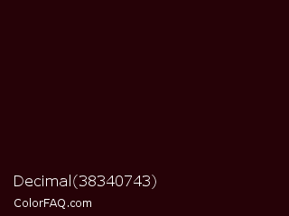 Decimal 38340743 Color is a almost black red color and the nearest color is Sepia Black #2b0202. Hex code #260207 and RGB value is rgb(38,2,7). In RGB color space, this color is composed of 15% red, 1% green, 3% blue, In CMYK color space, this color is composed of 0% cyan, 95% magenta, 82% yellow , 85% black , In HSL color space, this color has a hue angle of 352° , 90% saturation and 8% lightness.