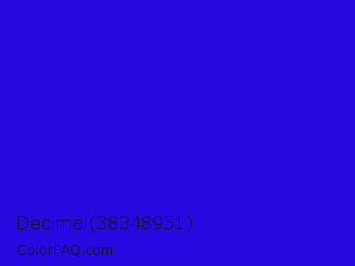 Decimal 38348951 Color is a normal indigo color and the nearest color is Bluebonnet #1c1cf0. Hex code #2609e1 and RGB value is rgb(38,9,225). In RGB color space, this color is composed of 15% red, 4% green, 88% blue, In CMYK color space, this color is composed of 83% cyan, 96% magenta, 0% yellow , 12% black , In HSL color space, this color has a hue angle of 248° , 92% saturation and 46% lightness.