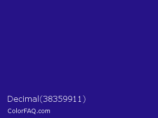 Decimal 38359911 Color is a dark indigo color and the nearest color is Blue Gem #2c0e8c. Hex code #261387 and RGB value is rgb(38,19,135). In RGB color space, this color is composed of 15% red, 7% green, 53% blue, In CMYK color space, this color is composed of 72% cyan, 86% magenta, 0% yellow , 47% black , In HSL color space, this color has a hue angle of 250° , 75% saturation and 30% lightness.