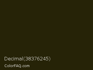 Decimal 38376245 Color is a almost black yellow color and the nearest color is Mikado #2d2510. Hex code #262307 and RGB value is rgb(38,35,7). In RGB color space, this color is composed of 15% red, 14% green, 3% blue, In CMYK color space, this color is composed of 0% cyan, 8% magenta, 82% yellow , 85% black , In HSL color space, this color has a hue angle of 54° , 69% saturation and 9% lightness.