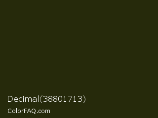Decimal 38801713 Color is a very dark yellow color and the nearest color is Onion #2f270e. Hex code #262a0b and RGB value is rgb(38,42,11). In RGB color space, this color is composed of 15% red, 16% green, 4% blue, In CMYK color space, this color is composed of 10% cyan, 0% magenta, 74% yellow , 84% black , In HSL color space, this color has a hue angle of 68° , 58% saturation and 10% lightness.