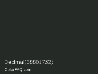 Decimal 38801752 Color is a very dark green color and the nearest color is Charleston Green #232b2b. Hex code #262a26 and RGB value is rgb(38,42,38). In RGB color space, this color is composed of 15% red, 16% green, 15% blue, In CMYK color space, this color is composed of 10% cyan, 0% magenta, 10% yellow , 84% black , In HSL color space, this color has a hue angle of 120° , 5% saturation and 16% lightness.