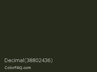 Decimal 38802436 Color is a very dark green color and the nearest color is Log Cabin #242a1d. Hex code #262b1c and RGB value is rgb(38,43,28). In RGB color space, this color is composed of 15% red, 17% green, 11% blue, In CMYK color space, this color is composed of 12% cyan, 0% magenta, 35% yellow , 83% black , In HSL color space, this color has a hue angle of 80° , 21% saturation and 14% lightness.
