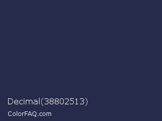 Decimal 38802513 Color is a very dark blue color and the nearest color is Space Cadet #1d2951. Hex code #262b4b and RGB value is rgb(38,43,75). In RGB color space, this color is composed of 15% red, 17% green, 29% blue, In CMYK color space, this color is composed of 49% cyan, 43% magenta, 0% yellow , 71% black , In HSL color space, this color has a hue angle of 232° , 33% saturation and 22% lightness.