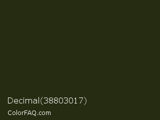 Decimal 38803017 Color is a very dark lime color and the nearest color is Black Olive #242e16. Hex code #262c11 and RGB value is rgb(38,44,17). In RGB color space, this color is composed of 15% red, 17% green, 7% blue, In CMYK color space, this color is composed of 14% cyan, 0% magenta, 61% yellow , 83% black , In HSL color space, this color has a hue angle of 73° , 44% saturation and 12% lightness.