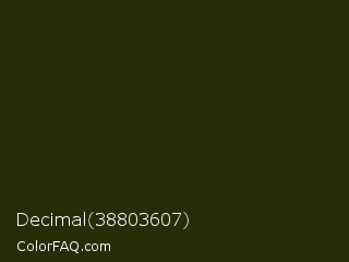 Decimal 38803607 Color is a very dark lime color and the nearest color is Turtle Green #2a380b. Hex code #262d09 and RGB value is rgb(38,45,9). In RGB color space, this color is composed of 15% red, 18% green, 4% blue, In CMYK color space, this color is composed of 16% cyan, 0% magenta, 80% yellow , 82% black , In HSL color space, this color has a hue angle of 72° , 67% saturation and 11% lightness.